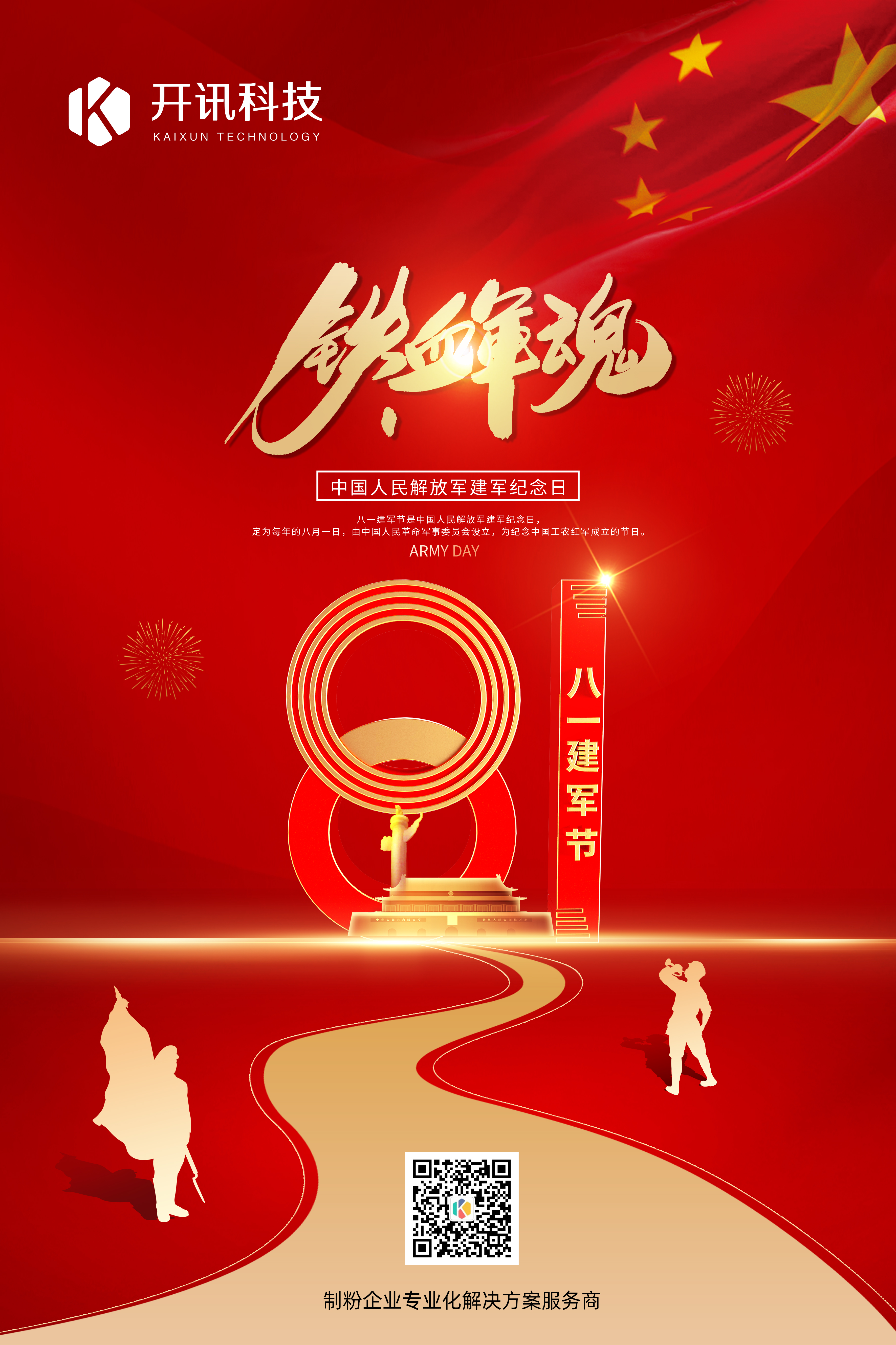阜陽開訊科技有限公司攜全體員工熱烈祝賀中國人民解放軍建軍95周年,阜陽開訊科技有限公司也將繼續(xù)為糧油企業(yè)提供完善的服務(wù),提供數(shù)字化建設(shè)優(yōu)質(zhì)方案。